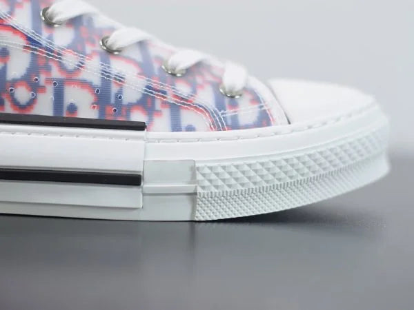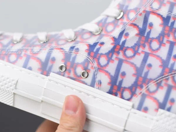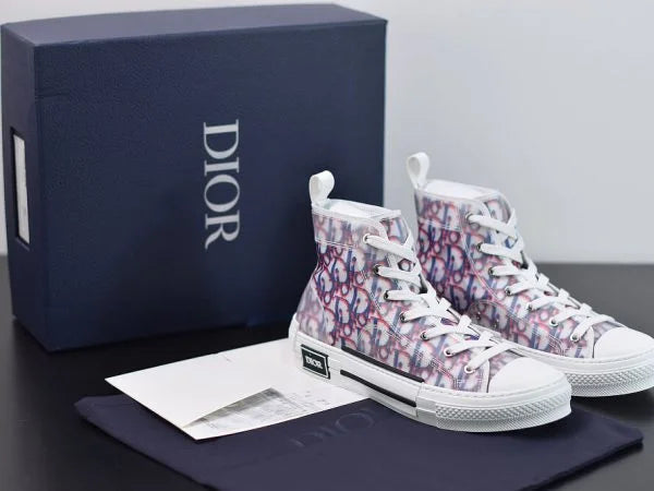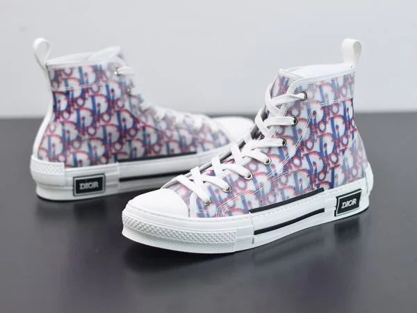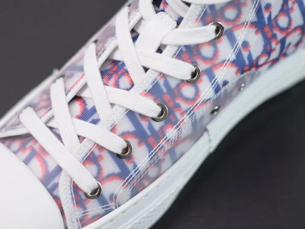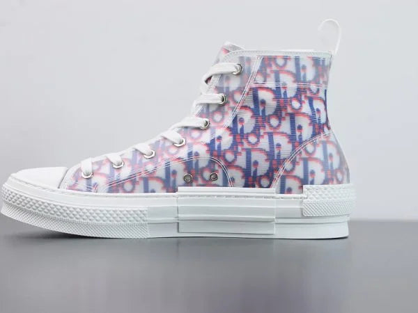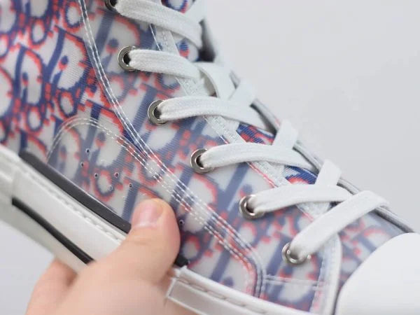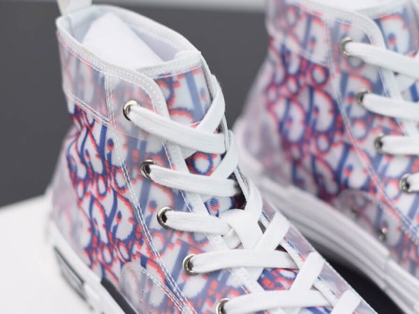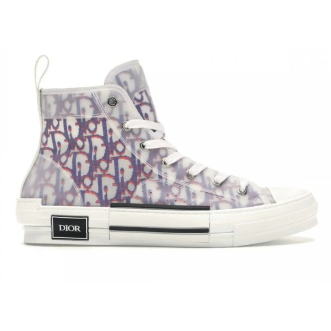 The B23 League high-top sneaker is set apart by its layering of transparent paneling and white and black Dior Oblique canvas. Essential details, such as eyelets and a lace-up front, a white rubber sole, a rounded and reinforced toe as well as a rear tab recall the codes of the classic high-top style. The sneaker is further enhanced with contrasting details on the sides, including a Dior signature, and pairs easily with any casual outfit.