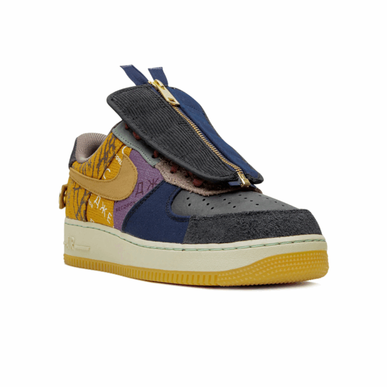 The Travis Scott x Nike Air Force 1 Low “Cactus Jack” is Scott’s intentionally rough-and-tumble reimagining of the revered silhouette. The patchwork design calls to mind Nike’s Bespoke Design Lab formerly located in downtown Manhattan for its sewn-together, DIY-inspired ethos. Scott outfits his second Air Force 1 Low collaboration with sturdy canvas patches that include shades of brown, lilac, dark navy blue, and black along the upper. A brown canvas Swoosh is located on each lateral side with a camo Swoosh on each medial side. Scott’s “Cactus Jack” graphics can be found printed across various panels of the upper. A black leather perforated toe contrasts the canvas, as does a unique black corduroy and blue nylon lace cover with a large gold zipper running down the middle. The medial side of the shoe